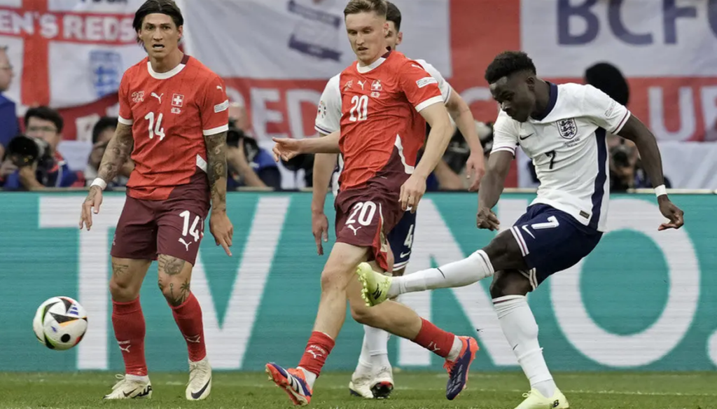 Keunggulan Swiss tak bertahan lama karena lima menit kemudian, Inggris menyamakan skor 1-1. Bukayo Saka melepaskan sepakan kaki kiri dari tepi kotak penalti. Tembakannya sempat membentur tiang, sebelum masuk ke gawang Swiss.